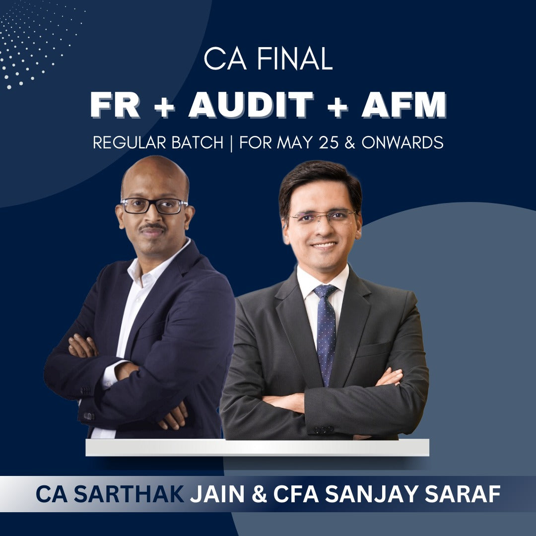 CA Final FR, Audit & AFM Regular Batch by CA Sarthak Jain & CFA Sanjay Saraf in 275+145+200 Hours. These Lectures are Beneficial for May 25/Nov 25/May 26/Nov 26 Attempts. Study Material will be Provided With the Same.