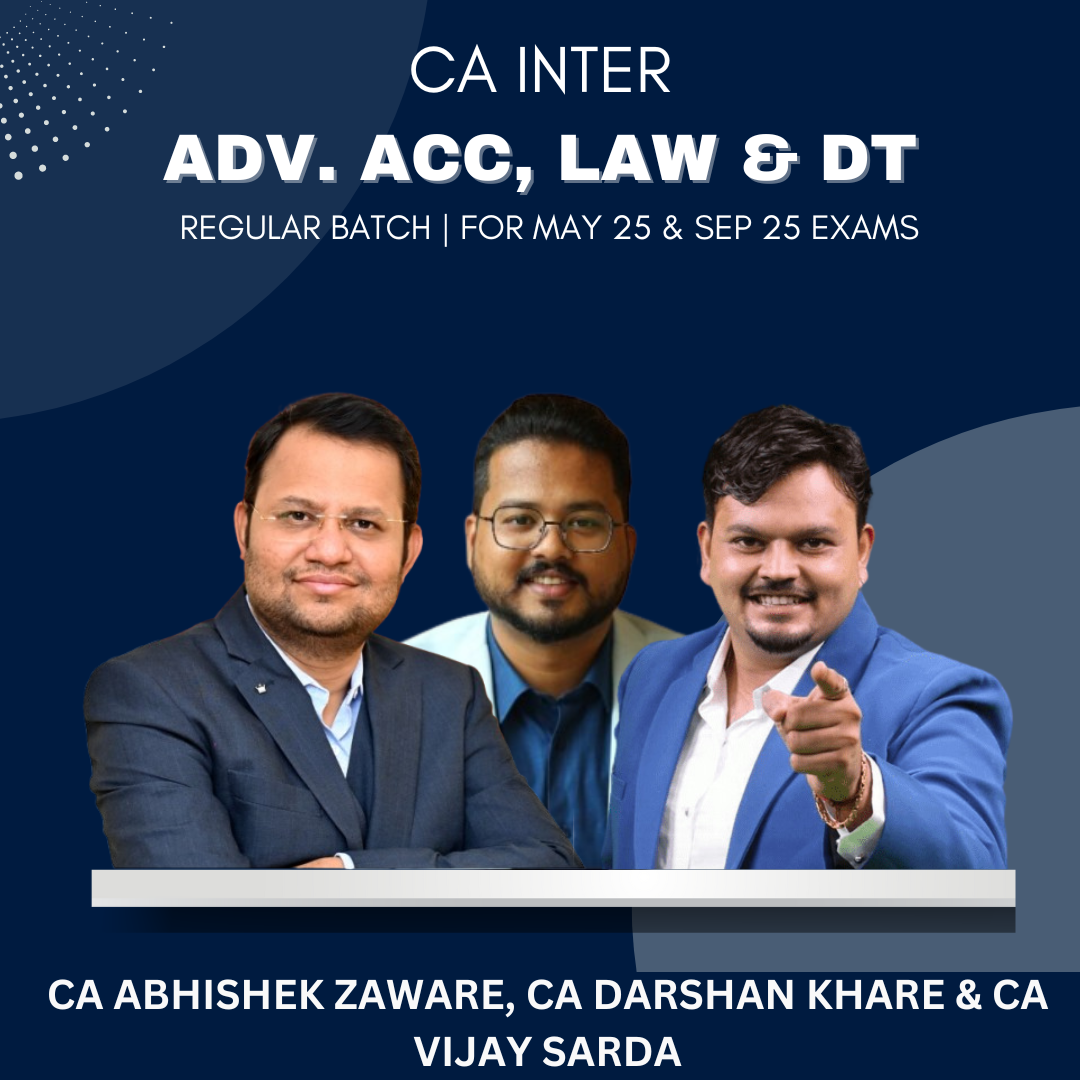 CA Inter Accounts, Law & DT Combo Regular Batch By CA Abhishek Zaware, CA Darshan Khare & CA Vijay Sarda in approx 235 Hrs. These lectures are beneficial for May 25 & Sep 25 Exams. Study materials will be provided with the same.